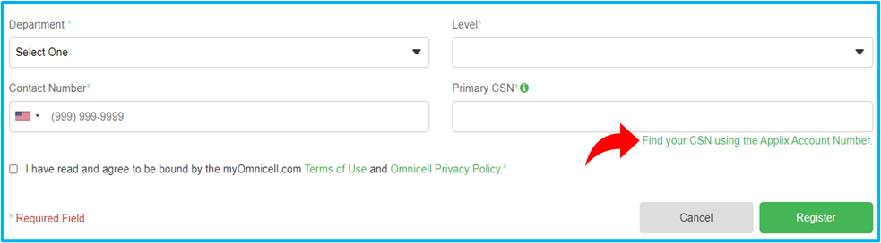 Thank you for contacting Omnicell Institute End-User Support! We apologize for the difficulty you're having when trying to register for an account. Unfortunately, we only have access to the Customer Service Number (CSN) listed on active accounts. However, you can locate your CSN using the 'Applix Account Number' link under the Primary CSN field.